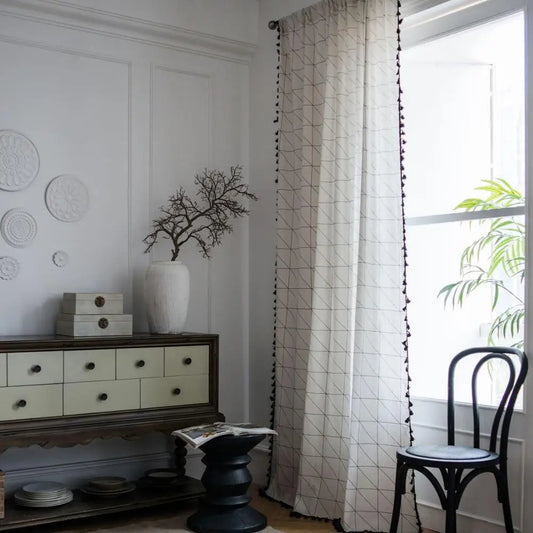 Cotton Linen Geometry Prints Curtain Thick Blackout Black Tassel Curtains for Living Room American Vintage Drape Kitchen Valance