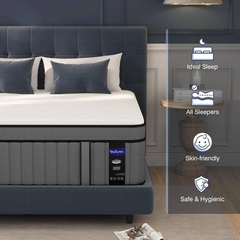 This full size mattress is designed to provide a peaceful sleep with its advanced motion isolation technology, which combines memory foam and individually pocketed springs. This feature minimizes motion transfer, making it ideal for light sleepers or couples who share the bed. The mattress contours to your body, offering targeted pressure relief and reducing back pain. Its hybrid design ensures a balance of comfort and support, leaving you feeling refreshed upon waking. The mattress also features enhanced edge support, thanks to durable coils that prevent sagging and maintain consistent comfort across the entire surface. This means you can sit or lie near the edge without compromising on stability. The full size mattress comes conveniently packaged in a box, making delivery and setup easy. It measures 75" x 54" x 10" and fits most bed frames, allowing for a quick and hassle-free transformation of your full-size bed. The mattress is covered in a breathable, skin-friendly knitted fabric that promotes air circulation and absorbs moisture, ensuring a comfortable and healthy sleep experience. The gel memory foam within the mattress helps to regulate temperature, keeping you cool throughout the night and allowing for a restful sleep.