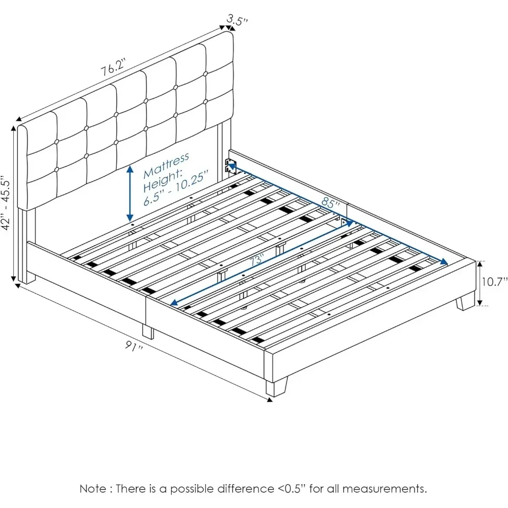 - Modern upholstery bed frame with button tufted design headboard.Manufactured from composite wood and nylon fabric, CARB P2 and 100% polyester