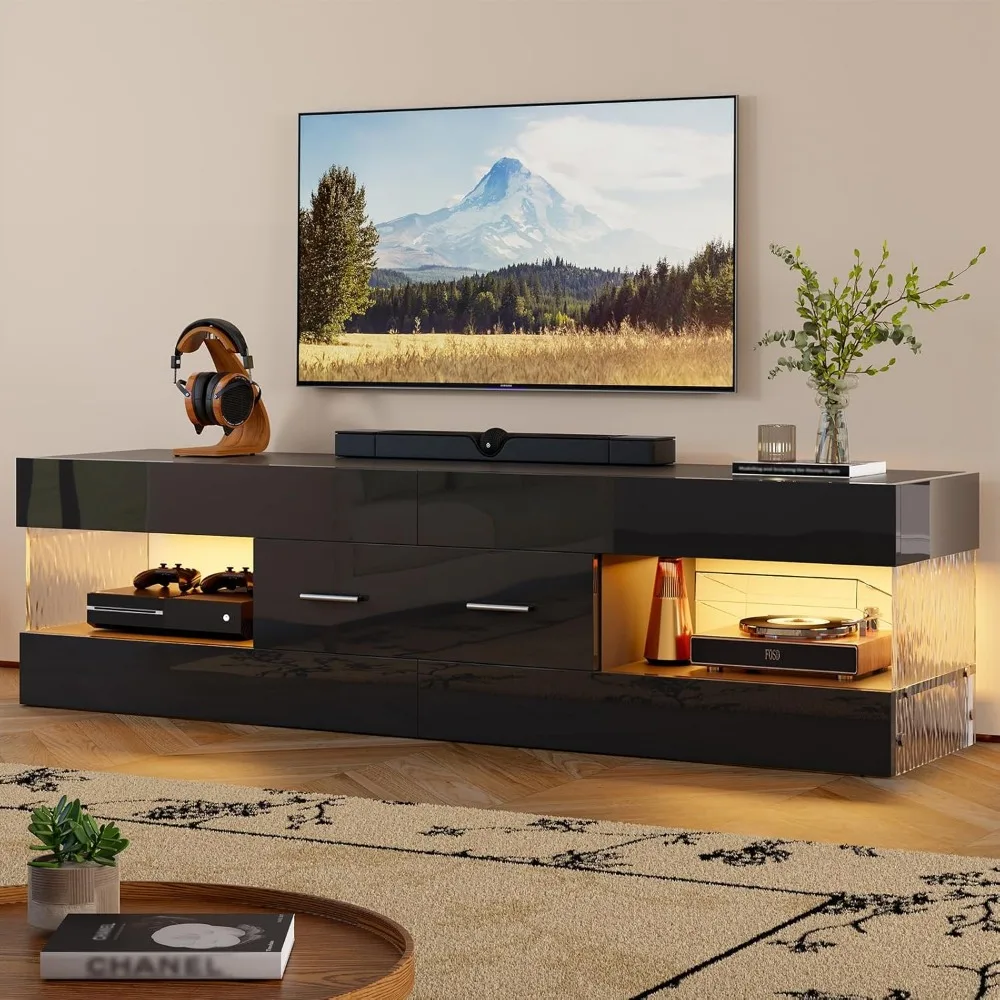 • TV Stand with LED Lights: The integrated LED strip offers 7 colors and 22 dynamic modes to brighten up your entertainment space. Depending on your mood or décor, use the included remote control to select different lighting colors to add a dynamic and modern look to your entertainment area