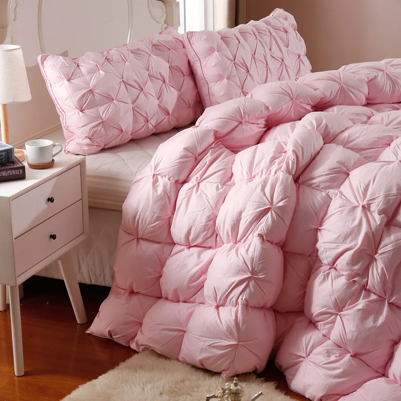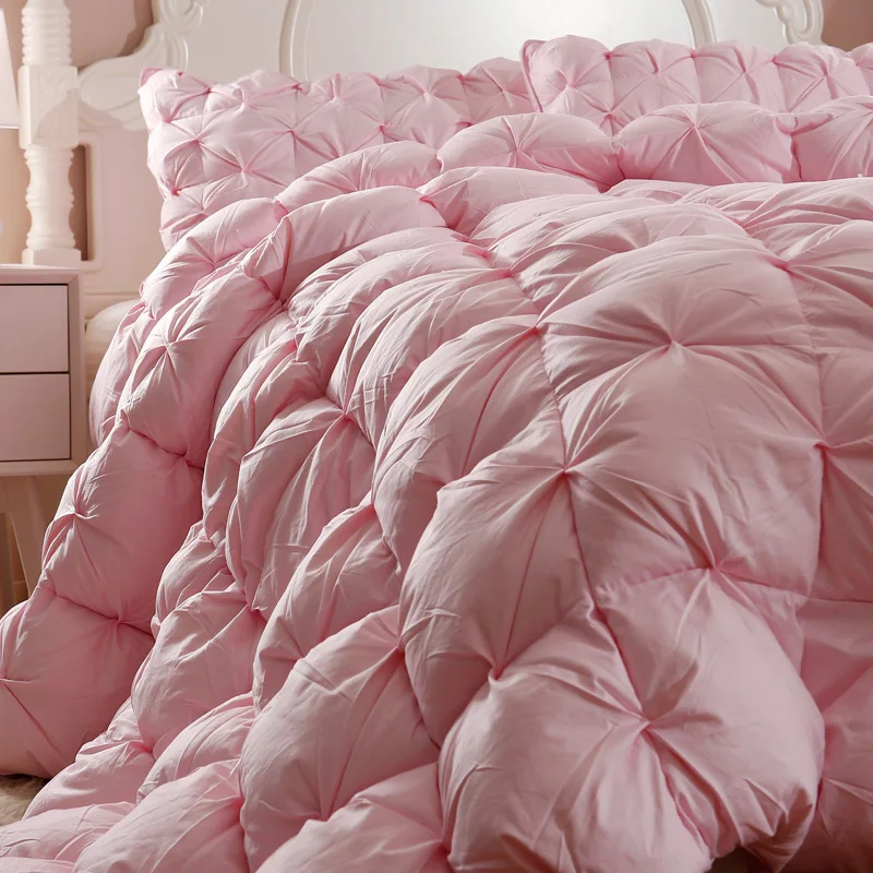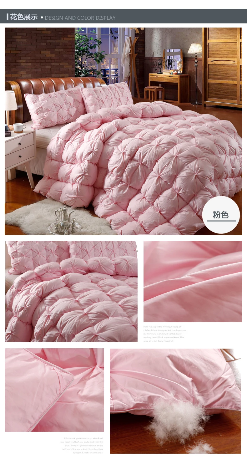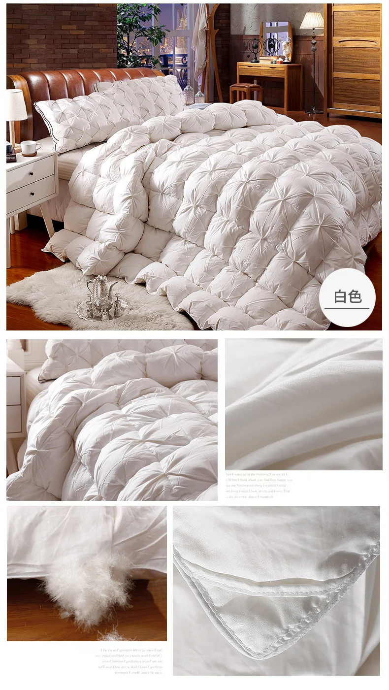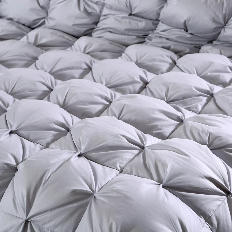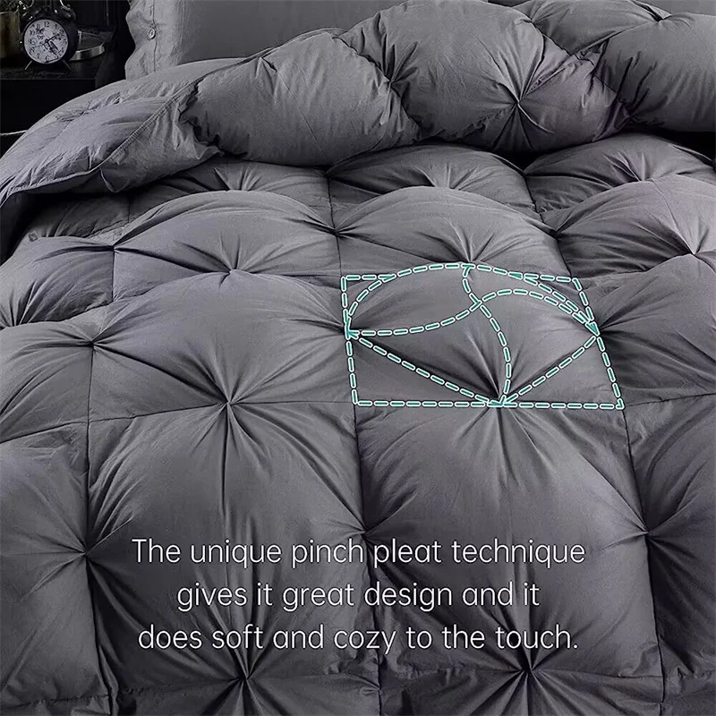 100% cotton shell soft fabric down comforter goose duck down and feather comforter. Luxurious white pinch pleat cloud like appearance comfort, total luxury, elegance and real warmth. Lightweight to sleep under and keeps you warm without adding extra weight.