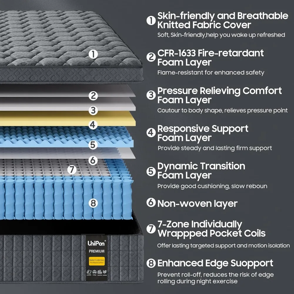 • 【Superior Comfort and Support】:The Hybrid queen mattress combines independent pocket springs and multiple layers of supportive foam. This combination ensures even weight distribution from head to toe, offering targeted support to fully relax your muscles and enjoy a restful sleep experience.