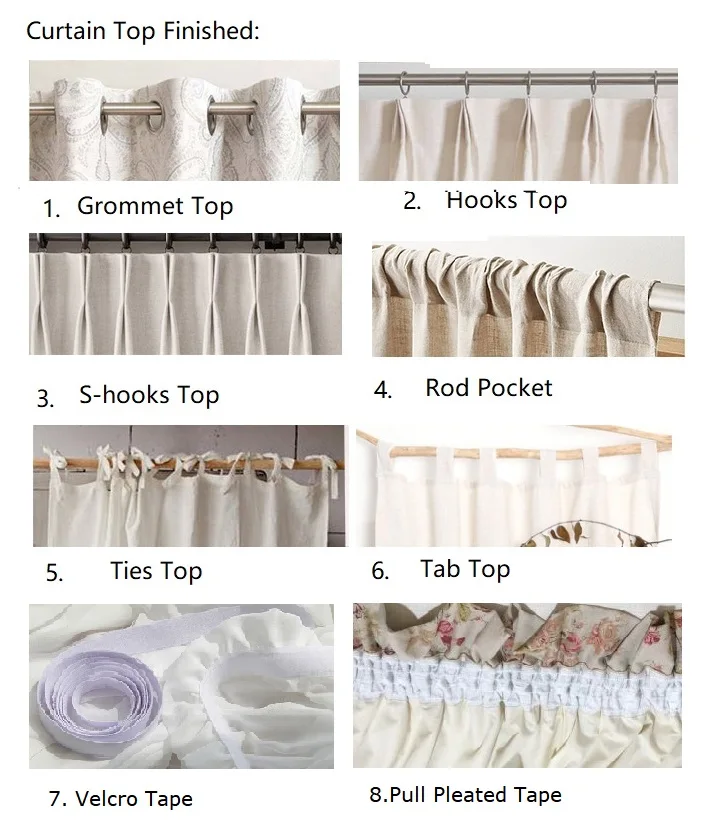 If you need 1.Grommet Top / 2.Hooks Top/3.S-hooks Top/4.Rod Pocket /or pull pleated tape, kindly contact us for custom made.
