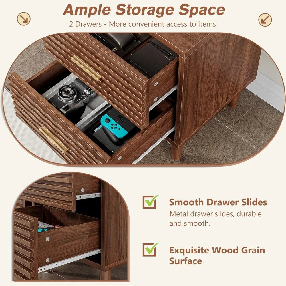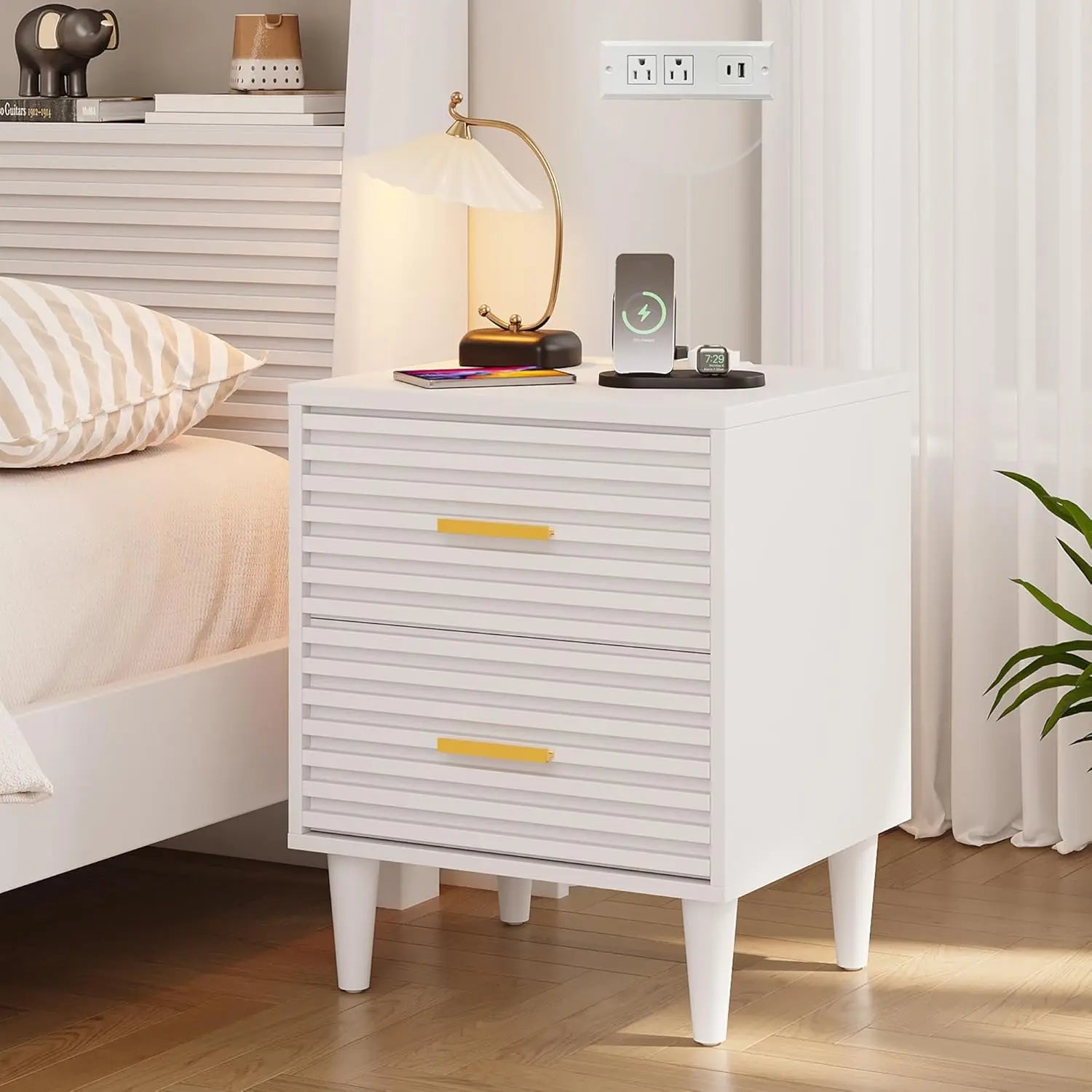 Night Stands with Charging Station, Mid Century Modern Nightstand, Fluted Bedside Table with Drawer, End Table Bed Side Tables