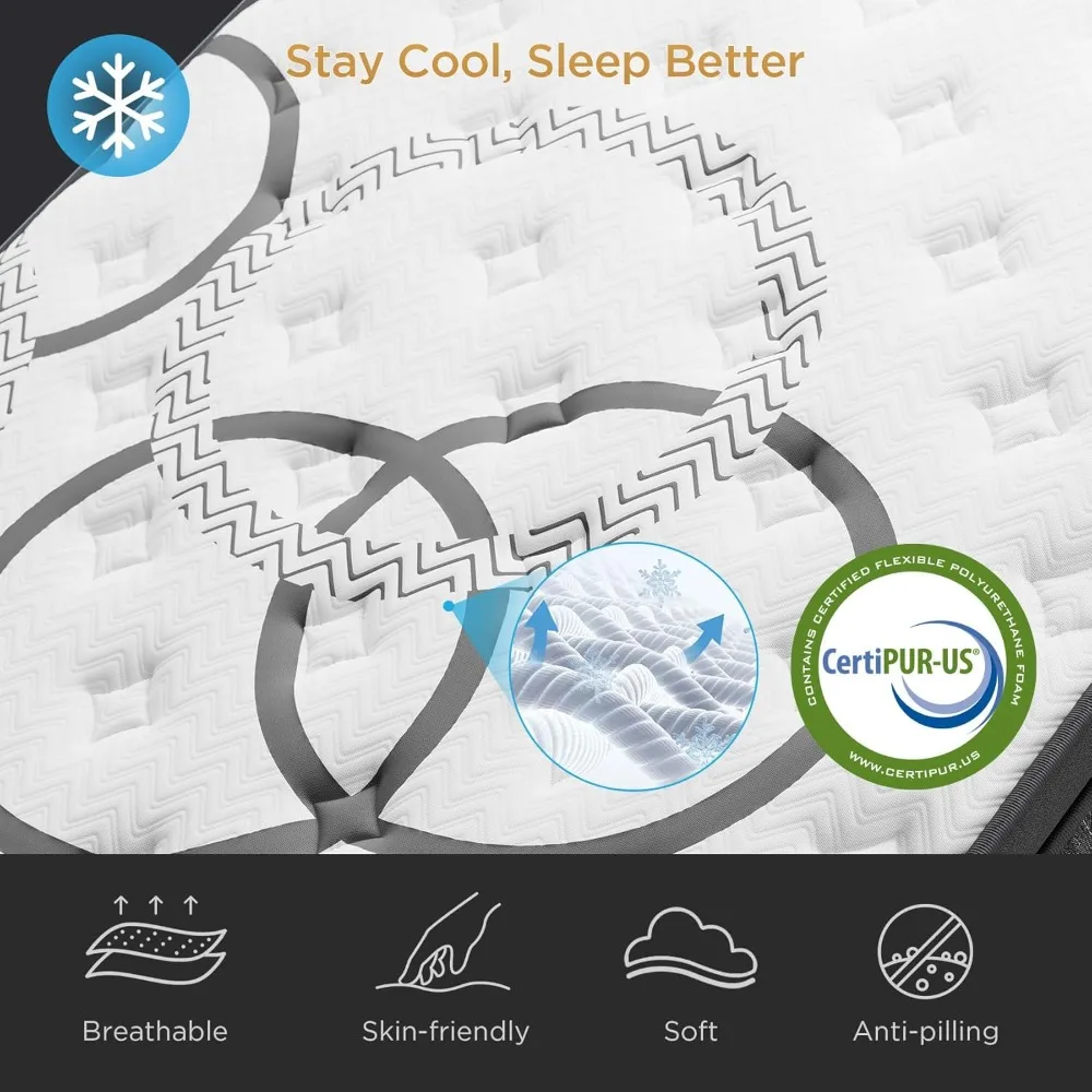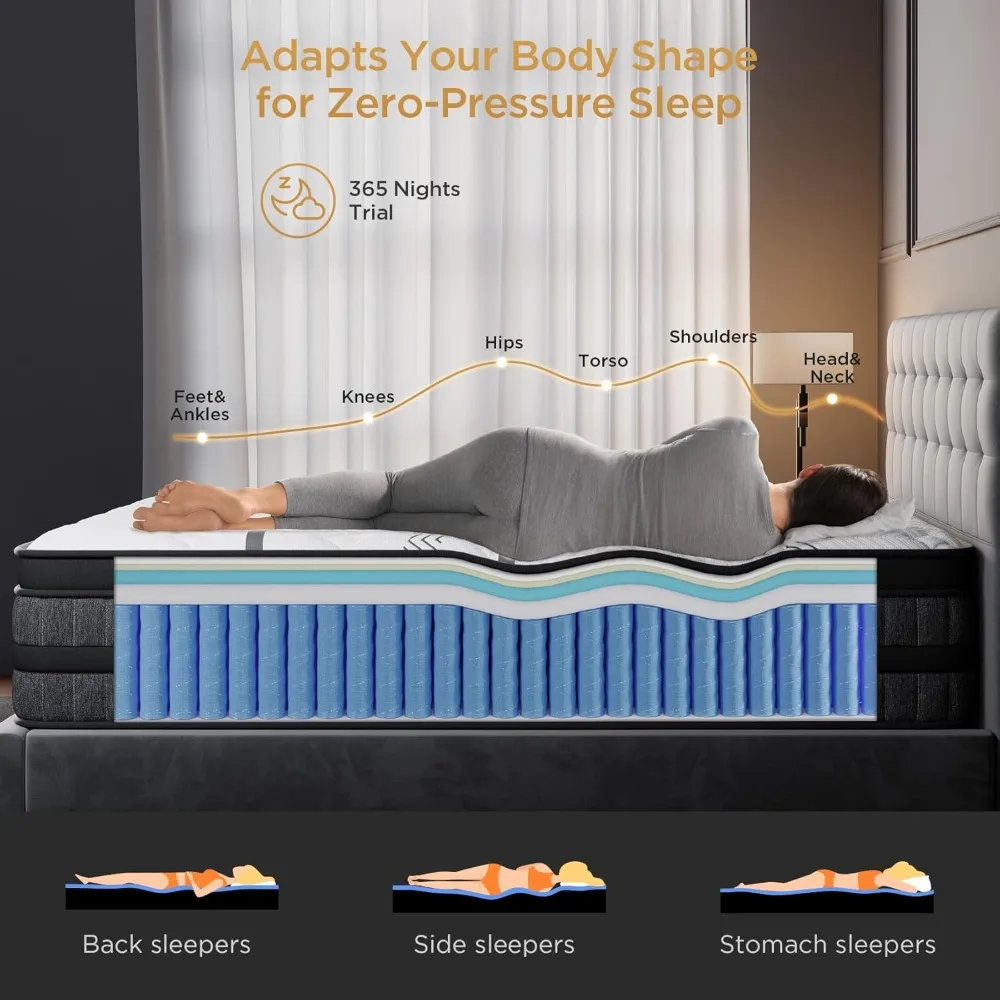 - Breathable and Comfortable: The queen mattress firm is made of skin-friendly knitted fabric and cooling gel memory foam, which can create an extremely comfortable touch and excellent breathability. The independent pocket spring system enhances air circulation and effectively absorbs steam and sweat from the contact surface, keeping your body comfortable, cool and dry all night. While the skin-friendly material can minimize skin irritation