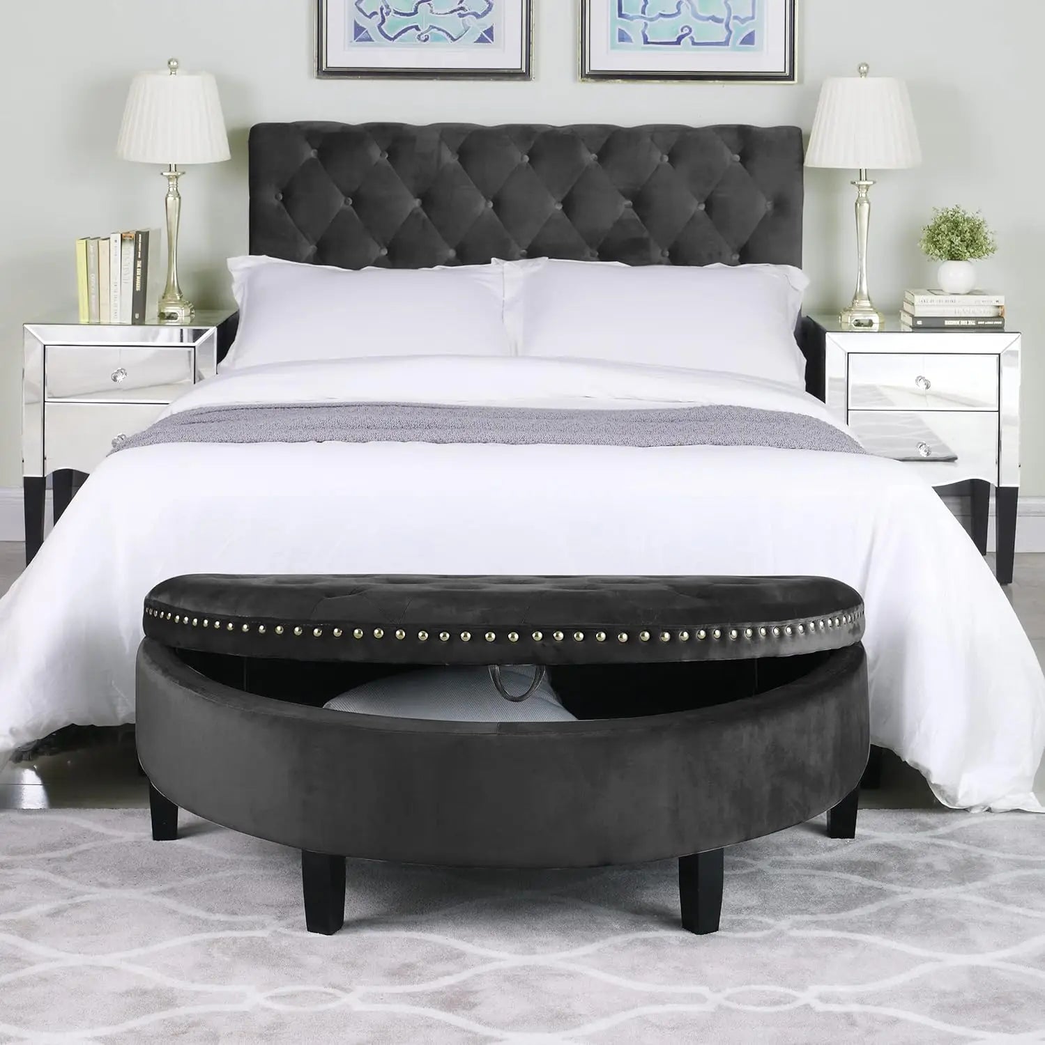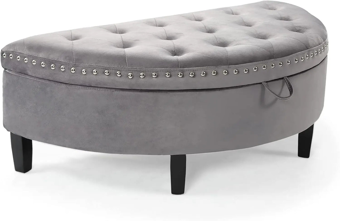 Storage Ottoman Button Tufted Velvet Upholstered Gold Nailhead Trim Espresso Finished Wood Legs Bench Modern Transitional