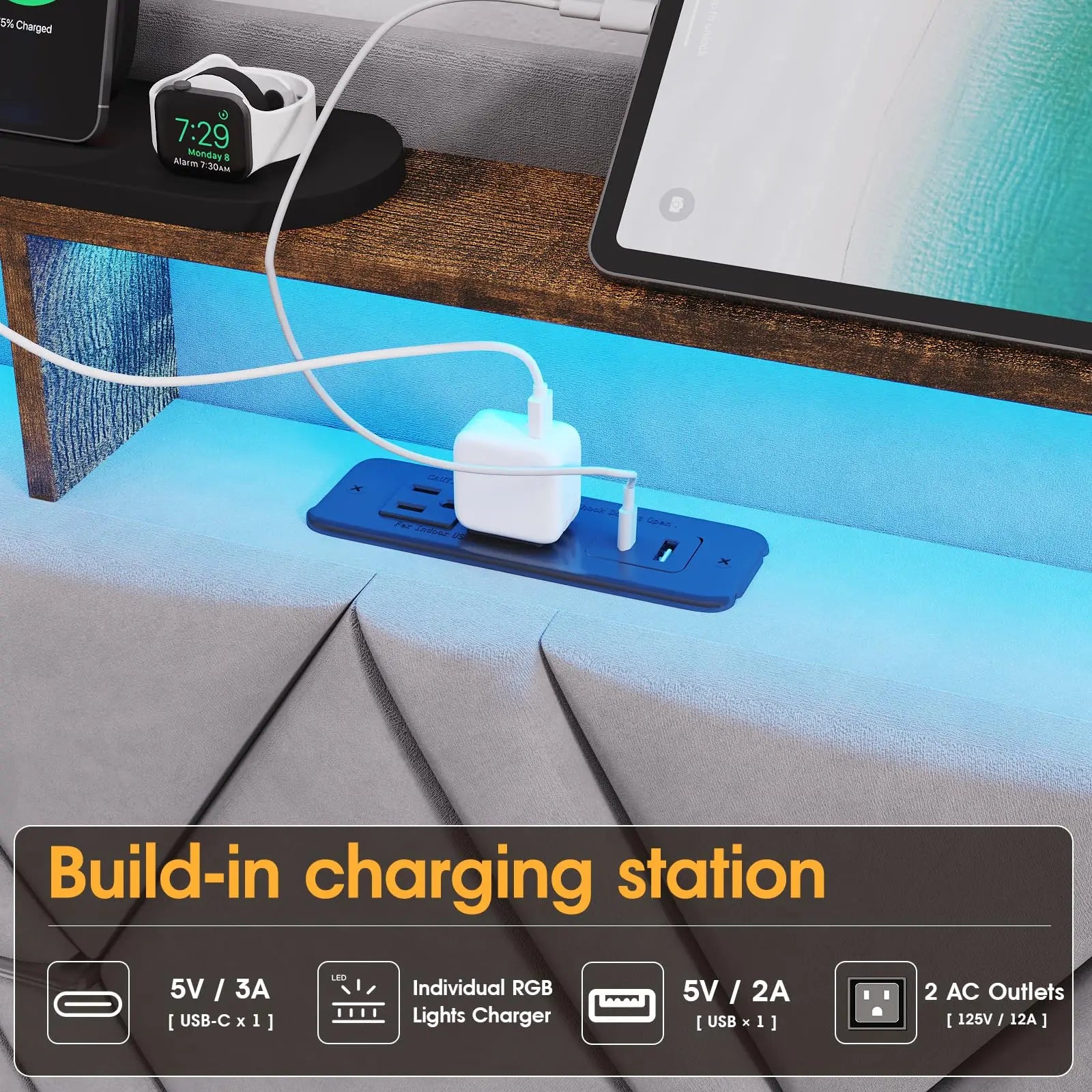 Upholstered Platform Bed With LED Lights & 3 Storage Drawers