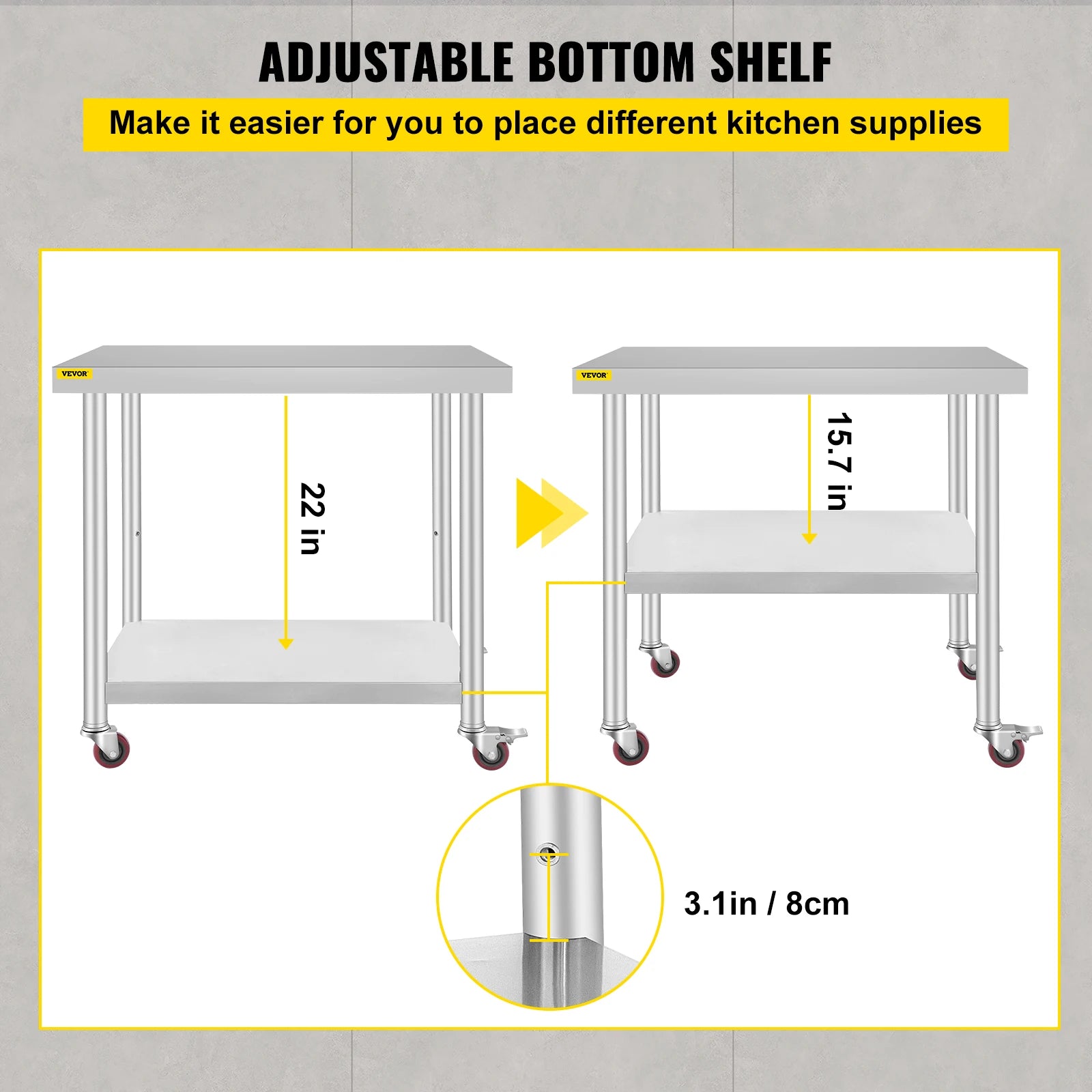 VEVOR Stainless Steel Kitchen Prep Table With 4 Caster Wheels & Backsplash Loads Up to 100KG-300KG for Home Storage Rack Dining
