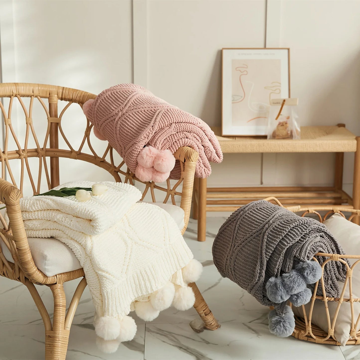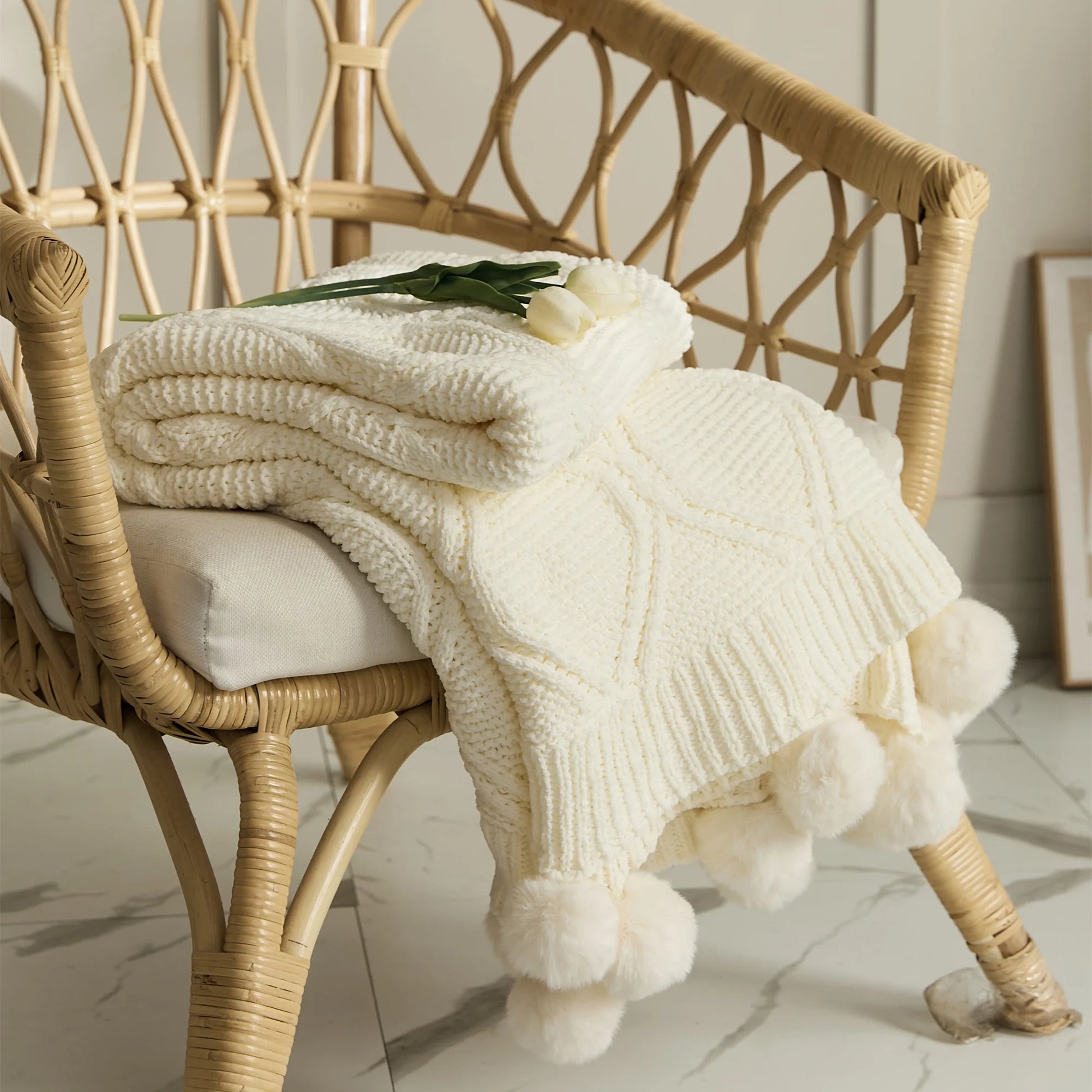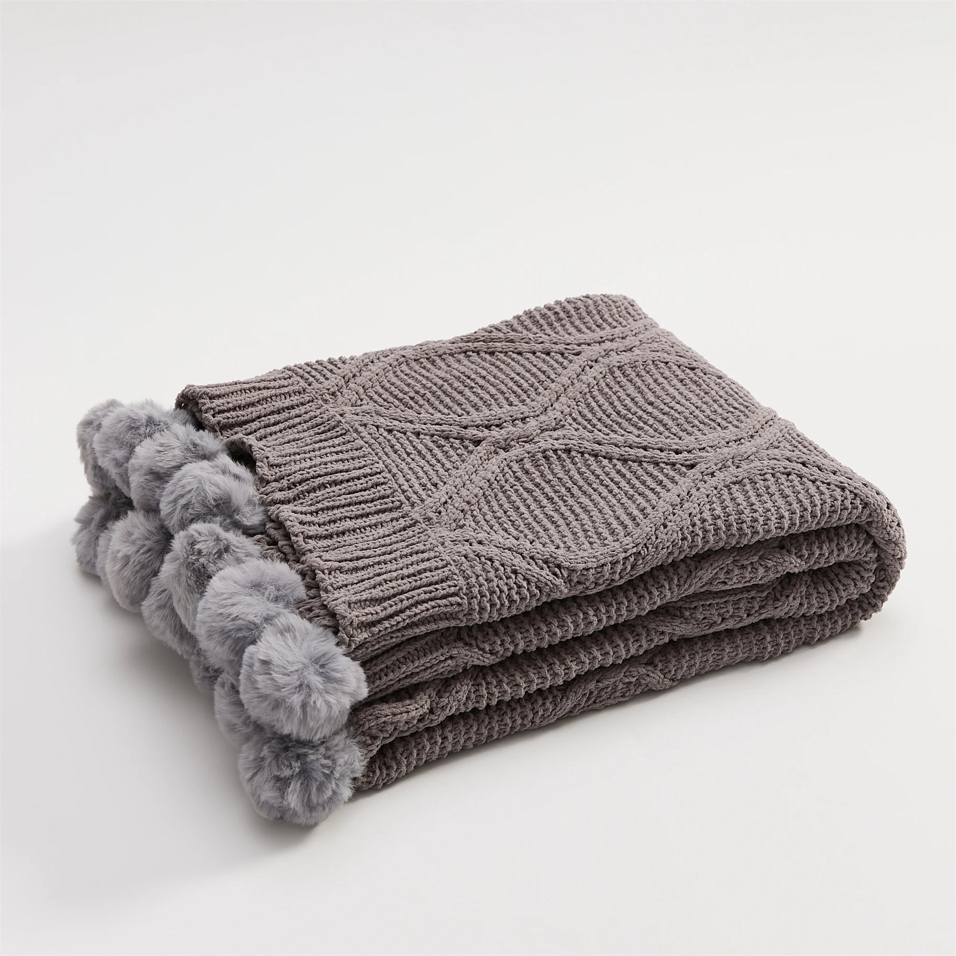 Soft Chenille Pompom Cable Knit Blanket